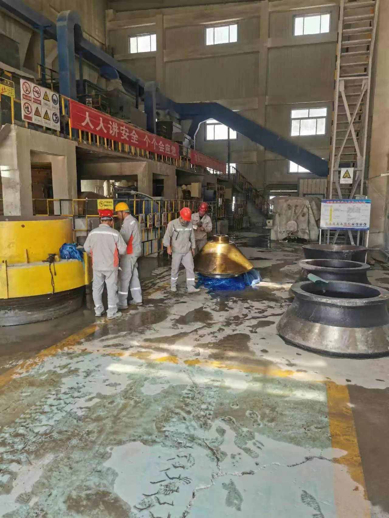 我們首先對設(shè)備進行了全面的檢查,在到達現(xiàn)場后,我們觀察了設(shè)備的運行情況。經(jīng)過檢查,我們確定了需要更換2號細碎動錐總成并安裝新襯板的需求。于上午9點開始拆卸2號細碎設(shè)備,更換襯板、潤滑油及動錐總成,并在中午1點完成更換工作。隨后,我們進行了帶料磨合,排礦口調(diào)整至23mm,電流控制在21A,帶料運行2小時,溫度最高48℃,壓力230bar,數(shù)據(jù)正常。在此過程中,我們嚴格按照操作規(guī)程進行操作,確保設(shè)備維護的質(zhì)量和效果。