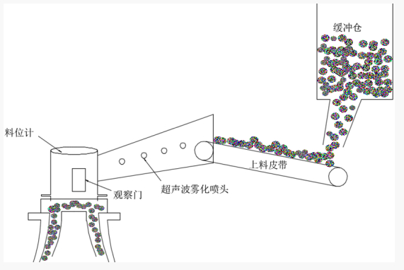 因破碎時產(chǎn)生粉塵過大,多數(shù)現(xiàn)場采用直接水管噴淋的方式降低粉塵的數(shù)量,卻導(dǎo)致給料過濕,從而減少破碎產(chǎn)能,并且對設(shè)備正常工作性能同樣也產(chǎn)生較大影響。