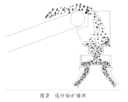 在原給礦膠帶機(jī)頭安裝一緩沖料斗,物料經(jīng)料斗緩沖后,正對分料盤,既解決了物料布料不均出現(xiàn)偏析的問題,又降低了現(xiàn)場揚(yáng)塵,設(shè)計(jì)給礦結(jié)構(gòu)見圖2。該給料斗可根據(jù)不同型號、不同給礦粒度選擇不同尺寸。